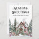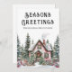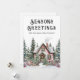Envíe sus mejores deseos esta temporada con esta tarjeta profesional de Navidades acuáticos, que incluye una acogedora cabaña de invierno rodeada de pinos y bayas. La cabaña cubierta de nieve, con una corona en la puerta y humo que sube de la chimenea, se sienta al final del diseño, añadiendo un toque festivo y invernal a tu mensaje de vacaciones. En la parte superior, "Season's Greetings" (Saludos de temporada) se muestra en texto negro, con un espacio debajo para el nombre de su empresa o un mensaje personalizado. El saludo puede cambiarse a "Feliz Navidad", "Felices Fiestas", o cualquier frase que se ajuste a tu voz de marca. La parte posterior de la tarjeta incluye espacio para el logotipo de una empresa, lo que la convierte en una opción perfecta para los envíos de correo de vacaciones corporativos o tarjetas de apreciación de clientes. Todo el texto y los colores se pueden personalizar para que coincidan con su marca.