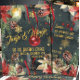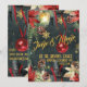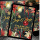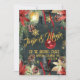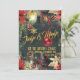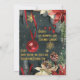 Una invitación festiva, lujosa y elegante para una fiesta de Navidad con un fondo de noche de invierno en un bosque verde oscuro con copos de nieve dorados brillantes, poinsettias pintadas al estilo acuarela, piñas, bayas rojas con una linterna cálidamente iluminada y un adorno de bola roja brillante en una cinta roja que cae en el aire. La parte delantera de la invitación dice: Jingle & Mingle, En casa de los Austin, Sábado 8 de diciembre, 20:00 h, mientras que la parte trasera tiene su dirección y los detalles necesarios para confirmar asistencia.