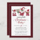 "Tarjeta de vacaciones de Fiesta Navideña Pequeña y Alegre de Gnomos Reno Cute." Ilustración de acuarela divertidamente alegre de una familia de gnomos y sus renos que te invitan a una Fiesta Navideña Pequeña y Alegre. Un par de renos y otro gnomo están en el reverso junto con un conjunto de cuadros rojos y negros de Buffalo en el diamante. Arte de Audrey Jeanne Roberts, derechos de autor.