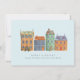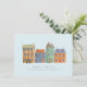 Tarjeta de felicitación navideña, una hilera de casas con decoración navideña en un día de invierno