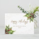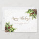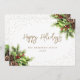 Tarjeta Happy Holidays blanca y dorada con un marco de nieve adornado con ramas de abetos, conos y bayas rojas. Personaliza fácilmente esta elegante tarjeta de vacaciones con tu texto.