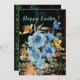 Encuentra esta linda tarjeta de vacaciones de Pascua con rosas y flores azules en un fondo negro con tonos de rosa y verde.