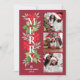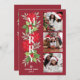 Esta moderna tarjeta de Navidades de tipografía floral incluye un collage de 3 fotos en la parte delantera y 1 foto horizontal extra en la parte posterior. El elegante diseño de la tipografía incluye un diseño de acuarela floral y verde de invierno con un superpuesto de texto "Merry" simple y moderno. Incluye hojas y bayas huecas, flores de poinsettia y ramas de hojas. Personalice el texto del personalizado con el apellido de su familia, el año, y un mensaje de vacaciones personalizado en la parte posterior de la tarjeta. Fondo rojo oscuro con colores rojo, verde y blanco.