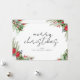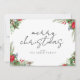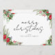 Feliz tarjeta navideña con tipografía de escritura minimalista y follaje festivo de invierno.