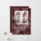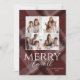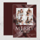 Esta divertida tarjeta de felicitación navideña para fotos de 5" x 7" presenta un diseño de cuadros borgoña con espacios para cuatro de tus fotos favoritas y tu nombre. La felicitación personalizable es "Alegre a Todos".