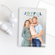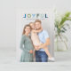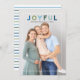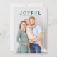 Este moderno y minimalista diseño de tarjeta fotográfica de vacaciones cuenta con un sencillo marco fotográfico con "JOYFUL" superpuesto en letras modernas de sans serif que está estilizado en colores azules y verdes. Personaliza tu foto de retrato favorita (5 x 7), los nombres de tus familiares y el año. El patrón de coordinación de franjas horizontales coloridas se viste por la parte posterior de la tarjeta. Los colores son: azul cobalto, oliva, azul acero, gris cazador, azul acuático, añil y acentos de gris oscuro.