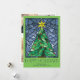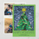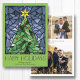 Estas tarjetas de felicitación de Navidad planas de 5" x 7" brillantes y coloridas presentan un diseño de ventana de vidrio emplomado pintado a mano con acuarela de un árbol de Navidad verde con una estrella dorada y adornos rojos enmarcados en hermosos tonos de azul sobre un fondo verde loro. La felicitación es "Felices Fiestas", en letras decorativas grandes con una felicitación editable, "Deseándote paz, amor y alegría en esta temporada navideña".