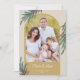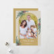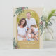 Una elegante tarjeta de Navidad con una foto arqueada de moda. El diseño está acentuado con vegetación de invierno y bayas sobre un fondo dorado.