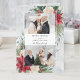 Este diseño clásico y tradicional presenta dos plantillas de fotos con un elemento central en blanco para su personalización sobre un fondo de poinsettias de color agua, rosas blancas y pino sobre un fondo gris polvoriento.