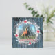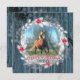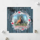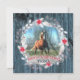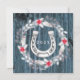 Tarjeta de Navidad personalizada con foto de caballo con la foto de su caballo en marco de madera azul desgastado, elementos plateados, corona de Navidad y herradura de caballo plateada en la parte posterior.