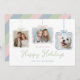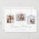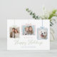 Difunde alegría navideña con esta elegante y personalizable tarjeta de vacaciones. Con tres recortes de fotos estilizados como adornos colgantes con lazos pastel, este diseño es perfecto para mostrar a su familia, niños y hasta a sus amigos peludos. El fondo blanco limpio resalta el mensaje festivo, “We Wish You Happy Holidays” (Les deseamos felices fiestas), en elegante letra cursiva, con espacio debajo para su firma personalizada. Una forma moderna y conmovedora de enviar amor y alegría a amigos y familiares en esta temporada de fiestas.