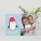 Envíe saludos festivos a sus amigos y familia con esta adorable tarjeta de Navidades pingüinos. La tarjeta fotográfica de vacaciones muestra un ilustracion de un pingüino usando un gorra rojo de invierno con un fondo de nieve azul y blanco. La frase "Deseos cálidos" se muestra en letras blancas y manuscritas con tu nombre o texto personalizado que se muestra a continuación en un guión caprichoso. Personaliza la tarjeta de vacaciones de pingüino con tu foto vertical favorita. La tarjeta se invierte para mostrar su mensaje personal.