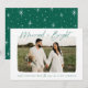 ¡Celebra tu primera Navidad como pareja casada con nuestra tarjeta de fotos de feriados casados y brillantes! La tarjeta incluye "Casado y Brillante" en una escritura verde y moderna con letras a mano. La foto horizontal del boda se muestra con un borde blanco de borde áspero. Personalice la parte delantera de la tarjeta agregando un saludo personalizado con los nombres que se muestran a continuación. La tarjeta se invierte para mostrar un fondo verde con un patrón estrella brillante blanco.