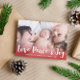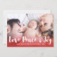 Tarjeta de foto de vacaciones con "Amor Paz y Alegría" escrita en una encantadora letra negrita en la parte superior de su propia foto, con un hermoso gradiente rojo profundo para hacer que el texto resalte.