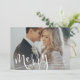 Tarjeta de vacaciones para navidades con la palabra "alegre" en un guión moderno y caprichoso. Tu foto de vacaciones se muestra detrás. La parte posterior de la tarjeta presenta un patrón de hojas de vacaciones. Gráficos ©LagartixaShop