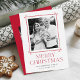 Carta de vacaciones con fotos dentro de un marco de un bastón de caramelo. "Feliz Navidad" se muestra con letras rojas de moda. Personalice la parte delantera de la tarjeta de Navidades de caña de caramelo añadiendo su nombre y el año. La tarjeta se revierte para mostrar una foto adicional y tu mensaje personal con letras blancas en un fondo rojo.