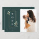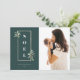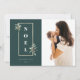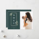 Elegante marco falso dorado pálido adornado con ramas de bayas de invierno sobre festivos fondos de color verde esmeralda mutado. Funciones de diseño, bajo el nombre en negrita NOEL, líneas de texto de plantilla para nombres, año y mensaje con una sola foto en la parte delantera y dos espacios de fotos de desvío en la parte posterior.