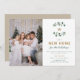 Una tarjeta de Navidad familiar elegante y refinada, simple, de cambio de dirección con una plantilla para una foto, que presenta un par de pequeñas ramas de bayas blancas de invierno que enmarcan el monograma familiar, con tipografía y caligrafía en verde de follaje navideño y tonos de dorado (no es lámina real). Una tarjeta de Navidad botánica encantadora que anuncia "nos hemos mudado" y que puedes personalizar con tu nombre(s), el año y una foto familiar (o foto de los niños, etc.). Un anuncio de mudanza elegante y con estilo.