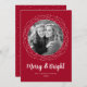 Tarjeta de vacaciones roja festiva con tu foto rodeada por un marco de círculo punteado. "Merry and Bright" se muestra en un guión manuscrito en negrita y blanco con su nombre y el año que se muestra a continuación. La tarjeta se revierte a un patrón punteado blanco con un fondo rojo.