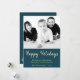 Tarjeta fotográfica de vacaciones de Navidades modernos con foto y tipografía de vacaciones Felices. El diseño tiene deseos de vacaciones felices, mensaje de vacaciones, el nombre de la familia, año y una foto - insertar una foto de tu familia o cualquier otra de tus fotos favoritas en la plantilla. El diseño es genial con una foto en blanco y negro. Al fondo de la tarjeta hay un árbol de Navidad hecho con copos de nieve en un fondo azul-verde oscuro. Personaliza todo el texto de la tarjeta o lo borras.