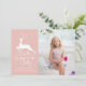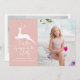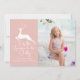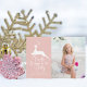 Un elegante ciervo blanco salta por encima de las palabras de los Navidades Esta es la temporada para ser alegre en esta hermosa tarjeta de vacaciones. Clásica elegancia con un reno de bonito sobre una preciosa caligrafía y una foto familiar llenando el frente de esta suave tarjeta de saludo rosa de melocotón. La parte de atrás es un simple patrón de puntos polka de moda sobre blanco.