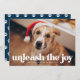 Tarjeta de Navidad temática de perro lindo que incluye la foto horizontal de tu perro con "desata la alegría" mostrado en letras blancas y en negrita. Personaliza la tarjeta de Navidad para perros agregando un saludo personalizado y tu nombre. La tarjeta se revierte para mostrar un patrón de huellas de patas de color azul marino y blanco.