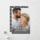 Tarjeta de foto de boda completa casada y alegre moderna de Navidad con ombre gris. Superposición de tipografía moderna y de caligrafía. En el reverso de la tarjeta hay un gris con un patrón de copos de nieve blancos.