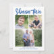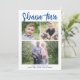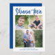 Esta moderna tarjeta de foto de Rosh Hashanah presenta un sencillo fondo blanco con un guión moderno de caligrafía en azul. El saludo en la parte delantera dice "Shana Tova". Tiene tres fotos (dos cuadradas y una horizontal). En la parte posterior hay un fondo azul de coordinación que se puede quitar o personalizar. Sugerencia de diseño: puede agregar otra foto o más texto al fondo.