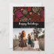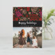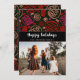 Tarjeta de vacaciones de foto familiar de Navidad con patrón de arte de línea única roja negra. Patrón de arte de una línea en rojo y rosa sobre fondo negro. Diseño festivo y moderno de vacaciones con una foto en un marco redondo. Agrega tu foto, tu texto en la parte frontal y en la parte posterior.