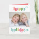 Una tarjeta de felicitación caprichosa de foto de vacaciones con un mensaje colorido de felices fiestas en la parte frontal para un ambiente divertido y festivo. El interior tiene otro espacio para una gran foto del cliente y un color de fondo coordinado con espacio para un mensaje personalizado.