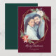 Esta elegante tarjeta de vacaciones presenta un bonito marco geométrico dorado decorado con ramos florales navideños festivos, todo sobre un fondo rojo festivo. Los ramos están hechos de rosas, poinsettias, piñas, bayas y ramas de pino. Personalice con un saludo de vacaciones personalizado, sus nombres y foto favorita. La parte trasera de la tarjeta es un hermoso tono de verde bosque, pero se puede personalizar a cualquier color que desee.