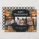 Hermosa tarjeta de Acción de Gracias con calabazas acuarelas en la parte delantera y un patrón de manto negro y blanco en la parte trasera. Personalice fácilmente esta tarjeta de 3 fotos de Acción de Gracias con sus fotos, el nombre de la familia y el año.