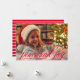 La tarjeta fotográfica estacional incluye un diseño de escritura caligráfica manuscrita de color rojo "Peace and Joy" con un texto serif moderno y personalizado que puede ser personalizado con el año y su familia / nombre. La parte posterior de la tarjeta incluye rayas horizontales blancas abstractas con un fondo de color rojo.