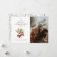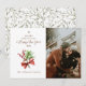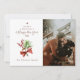 Elegante tarjeta de vacaciones para Navidades con una foto y Navidades y saludos de Año Nuevo en una mezcla de tipografía clásica y escritura manuscrita, colocada en forma de árbol de Navidad con una minúscula estrella arriba. El texto es de color marrón chocolate. La carta está decorada con un ramo acuático de pino y bayas atadas con un arco rojo. Debajo está tu apellido. El reverso presenta un fondo blanco sencillo con un patrón de ramas de oro falsas.