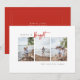 Diseño moderno de tipografía minimalista con tarjeta de foto navideña "Merry & Bright". Características, tres espacios verticales de fotos, guión "brillante" rojo festivo y respaldo rústico de color rojo. Líneas de texto de plantilla para el nombre de familia en la parte delantera, mensaje y nombres en la parte posterior.