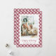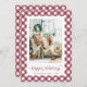 Personalizado tarjeta de vacaciones de fotos de mantas rojas con un patrón de cuadros rojos y blancos y una fuente de escritura moderna. Personaliza fácilmente esta tarjeta de vacaciones de fotos de gingham con tu foto y el nombre de la familia.