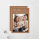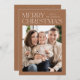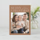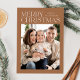 Tarjeta fotográfica navideña moderna con "Feliz Navidad" mostrada en la parte superior del diseño con letras blancas de moda con un fondo toffee-marrón. Personalice la tarjeta de Navidades simples con su nombre y foto de familia. La tarjeta se invierte para mostrar un fondo toffee-marrón con puntos blancos sutiles (nieve).