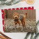 Cuta tarjeta de Navidades con temática de mascota con la foto horizontal de su mascota con "Pawsitive Merry" en un sobrepuesto de escritura manuscrita blanca. Personalice la parte delantera de la tarjeta de Navidades del mascota con el saludo de su personalizado, el nombre de su familia y el año. La tarjeta se invierte para mostrar un patrón de impresión de pata roja y blanca.