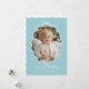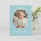 Tarjeta de vacaciones con foto retro ondulada azul pastel y blanca. Un diseño moderno dulce y simple con vibraciones retro. Se muestra en una paleta de azul claro y blanco, pero ¡TODOS LOS COLORES SON EDITABLES! Elige nuevos colores para complementar tu foto. La foto se recortará al marco ondulado y se delineará con un borde adorable dibujado a mano y un lazo simple. "Feliz Navidad" está incluido como elemento de diseño. Personaliza la plantilla con el año y tu(s) nombre(s). La parte trasera de la tarjeta tiene un patrón de lazo continuo complementario. © Kimbellished, LLC