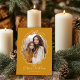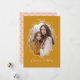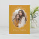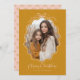 Tarjeta de festividad de fotos retro rosada Rubor amarillo mostaza. Un diseño moderno, dulce y sencillo, con vigas retro. Se muestra en amarillo mostaza y rosa rubor, PERO TODOS LOS COLORES SON EDITABLES. Seleccione los colores que complementen su foto. La foto será recortada al marco ondulado y delineada con un lindo borde dibujado a mano y una simple reverencia. "Feliz Navidad" se incluye como elemento de diseño. Personalice la plantilla con el año y su nombre. La parte posterior de la tarjeta es un patrón de arco sin costuras complementario. © Kimbellished, LLC