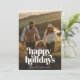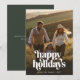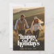 Esta tarjeta de vacaciones vertical para Navidades de Fiestas Felices Retro ofrece un diseño limpio y sofisticado con una foto familiar completa y una gran tipografía de escritura retro "Happy Holidays". El estilo informal aunque retro se mezcla sin esfuerzo con el entorno natural, lo que lo convierte en una opción perfecta para las familias que buscan un saludo atemporal.