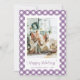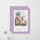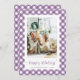 Personalizado tarjeta de vacaciones con foto de manta morada con un patrón de cuadros morado y blanco y una fuente de escritura moderna. Personaliza fácilmente esta tarjeta de vacaciones de fotos de gingham con tu foto y el nombre de la familia.