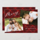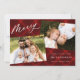 Elegante tarjeta fotográfica de vacaciones con "Merry" en un moderno guión de caligrafía blanca sobre un fondo de manto rojo pintado. Personalice el frente agregando dos de sus fotos favoritas, saludo, nombre y año. La carta de los Navidades rústicos se revierte para mostrar una foto adicional con un fondo de manto rojo nevado.