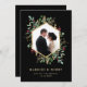 Esta hermosa tarjeta de Navidad para recién casados cuenta con su propia foto de boda, rodeada de un marco geométrico de oro falso con hojas doradas a juego, vegetación navideña y bayas de acebo rojas sobre un fondo negro moderno. El texto elegante dice "Casados y alegres".