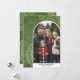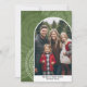 Una moderna tarjeta de fotos de Feliz Navidad en tonos de aceitunas y verdes. El área de fotos es un arco moderno con un borde blanco. El diseño moderno incluye rayas y el tipo clásico para la parte principal del texto. El fondo es un diseño abstracto moderno con puntos y círculos con un lugar para 2 fotos más.