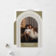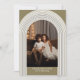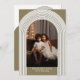 Una moderna tarjeta de fotos de Feliz Navidad en tonos dorados. La foto es un arco moderno con un borde dorado.