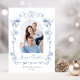 Elegante tarjeta navideña con tu foto en un arco dentro de un polvoriento marco azul dibujado a mano adornado con campanas, arcos y flores de poinsettia, "Feliz Navidad" en un elegante guión azul polvoriento, y tu nombre familiar y el año en la tipografía clásica serif.