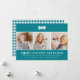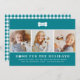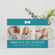 Celebra estar en casa para las fiestas con este diseño moderno con temática de mascotas que presenta tres fotos favoritas en un diseño limpio de azul verde y blanco. Un icono de año en forma de hueso, una huella de pata sutil y un mensaje clásico de “Hogar para las fiestas” lo hacen perfecto para familias que aman a su perro, especialmente uno rescatado recientemente, compartiendo momentos acogedores de Navidad con amigos y familiares.