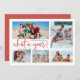 Tarjeta de vacaciones de Colage de Fotos del Año en Retrospectiva presenta 5 fotos familiares, letra caligráfica que dice 'qué año', un año y el nombre de la familia en la parte delantera. Personalice con su mensaje y noticias familiares en la parte trasera.