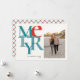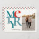 Estas tarjetas de felicitación de vacaciones para Navidades de 7" x 5" incluyen un marcador de posición para tu foto, nombre y año favoritos. Las letras de la palabra "Merry" son grandes y con diferentes colores de rojo y verde azulado sobre un fondo de marfil. La parte posterior tiene un diseño de línea cruzada coordinado.